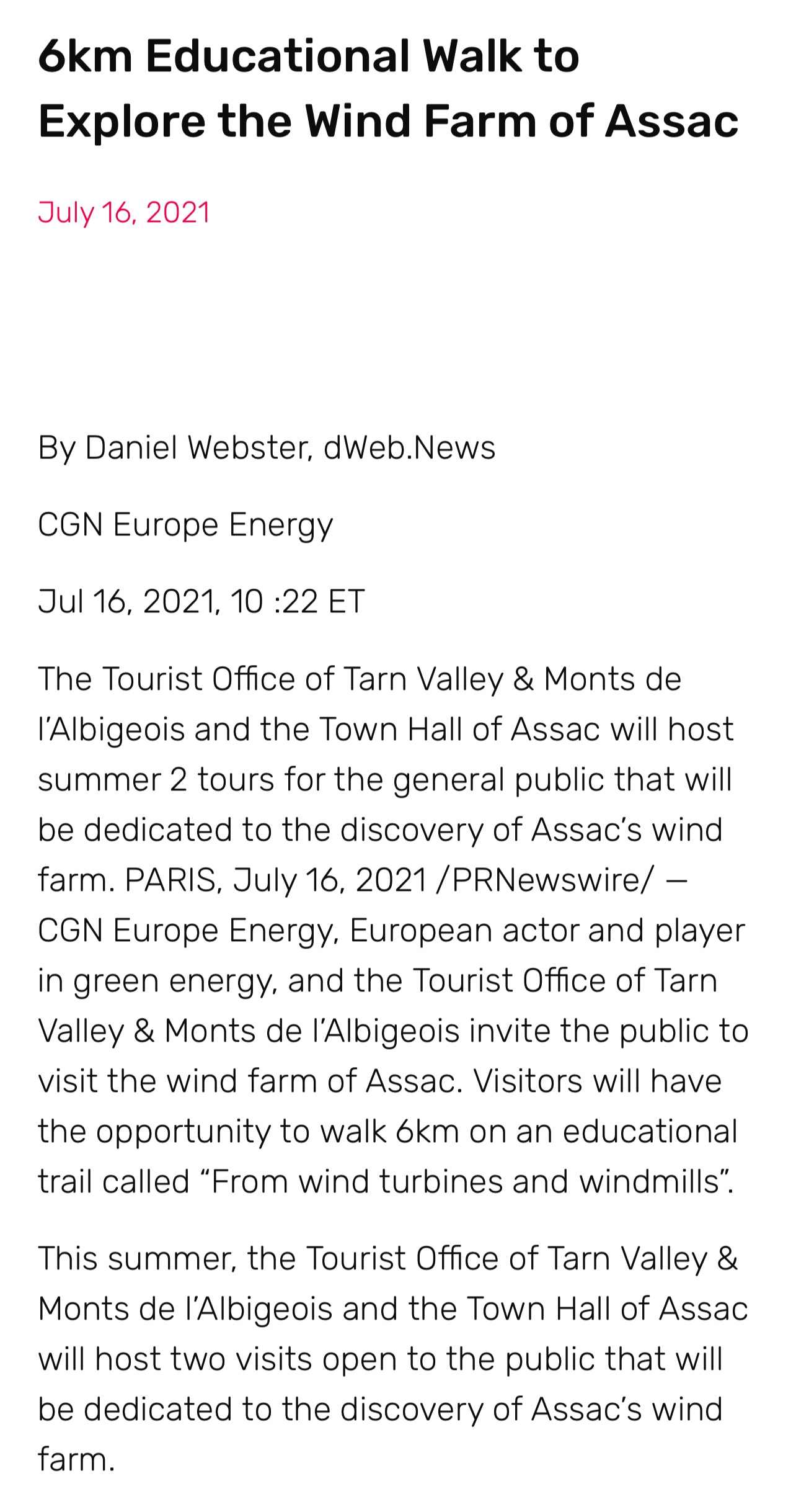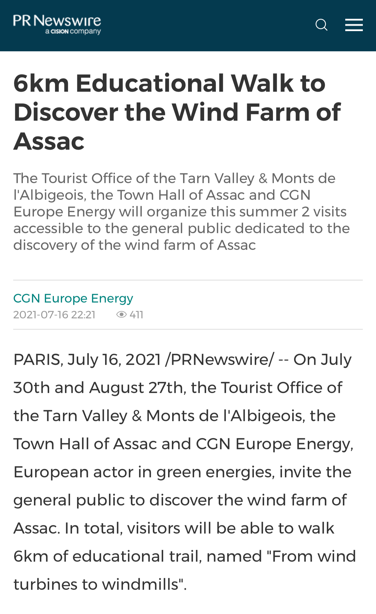 法國旅游網站Losiramag刊登報道中廣核歐能公司聯合塔恩河谷和阿爾比蓋奧山旅游局和Assac市政府將在今年夏天開展的“探索風電場”為主題的公益性參觀活動的旅游信息。
