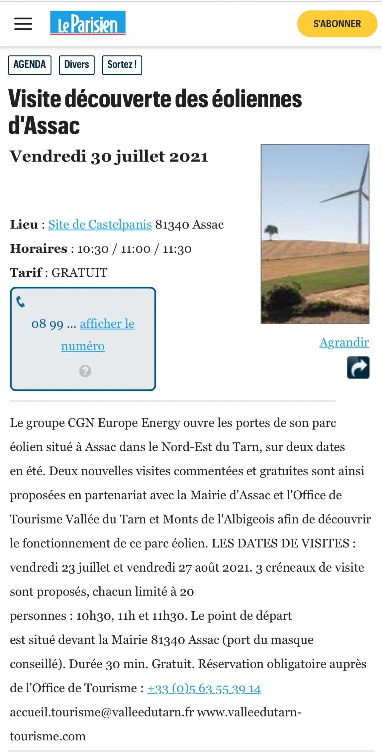 法國最大的日報之一《巴黎人報》報道歐能公司聯合塔恩河谷和阿爾比蓋奧山旅游局和Assac市政府將在今年夏天開展的“探索風電場”為主題的公益性參觀活動。該報每日紙質報紙發行量超過20萬份,讀者超過130萬人。