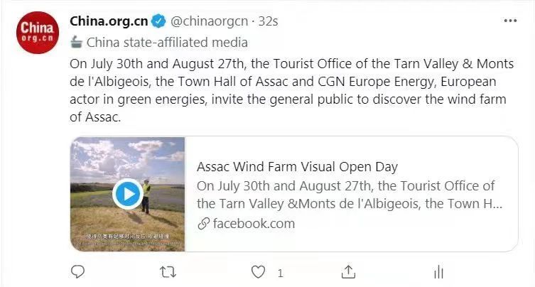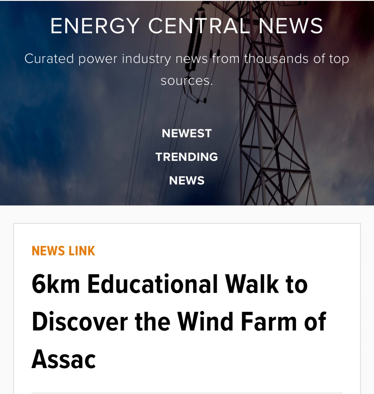 英語行業性媒體《Energy Central News》報道中廣核歐能公司聯合塔恩河谷和阿爾比蓋奧山旅游局和Assac市政府將在今年夏天開展的“探索風電場”為主題的公益性參觀活動。