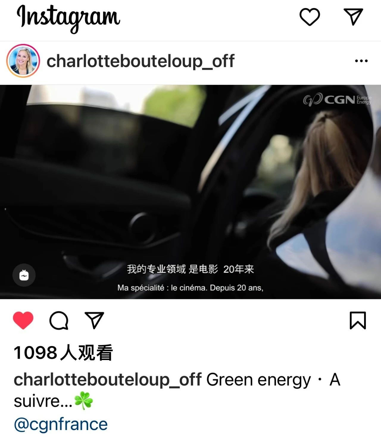 法國電視臺知名主持人夏洛特·布特魯普(Charlotte Bouteloup)與中國廣核集團的海外社交媒體賬號聯動,在其個人Instagram和Facebook上發布活動視頻,作為總粉絲量10萬+的大V,其Ins賬戶發布一小時內觀看人數上千。