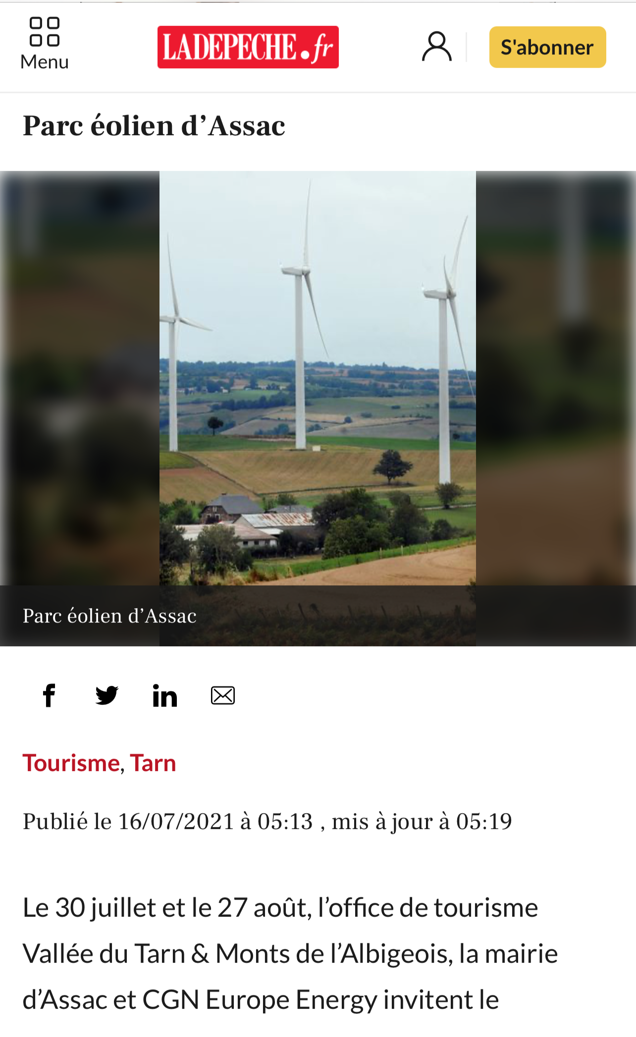 法國西南部地區性日報《快報》(La Dépêche)報道中廣核歐能公司聯合塔恩河谷和阿爾比蓋奧山旅游局和Assac市政府將在今年夏天開展的“探索風電場”為主題的公益性參觀活動。該報讀者人數73萬。