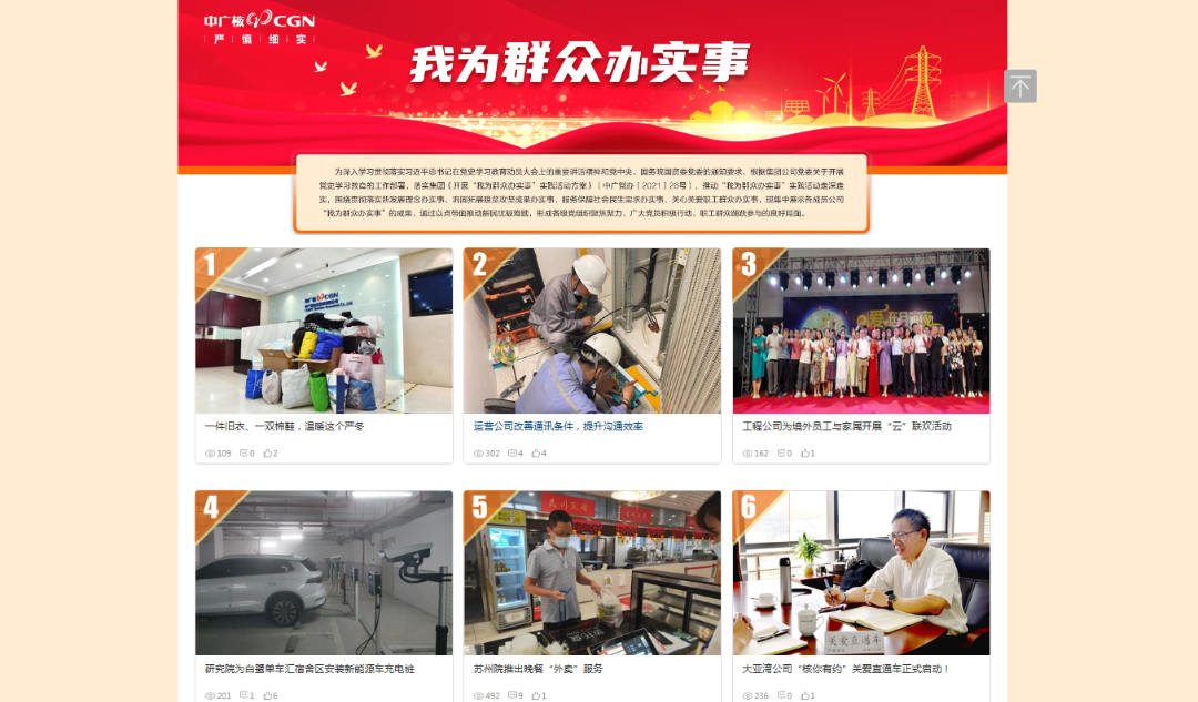 開(kāi)設(shè)“我為群眾辦實(shí)事”專題網(wǎng)頁(yè),曬辦實(shí)事成果。中廣核推出專題網(wǎng)頁(yè),集中展示各單位“我為群眾辦實(shí)事”代表性成果,每月對(duì)成果進(jìn)行滾動(dòng)更新。通過(guò)各單位曬成果,接受群眾監(jiān)督、開(kāi)展群眾評(píng)價(jià),形成各級(jí)黨組織聚焦聚力、廣大黨員積極行動(dòng)、員工群眾踴躍參與的良好局面。