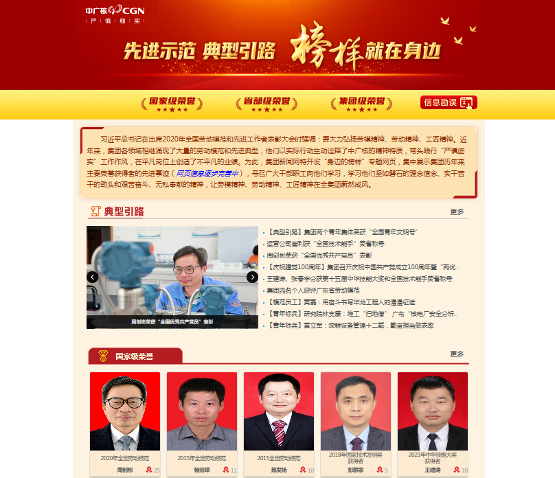 搭建“身邊的榜樣”專題網(wǎng)頁(yè),傳播先進(jìn)典型事跡。中廣核策劃推出“身邊的榜樣”專題網(wǎng)頁(yè),按照國(guó)家級(jí)、省部級(jí)、集團(tuán)級(jí)分類梳理建立個(gè)人榮譽(yù)檔案,集中展示先進(jìn)典型的主要榮譽(yù)、工作經(jīng)歷、歷年獲獎(jiǎng)情況、先進(jìn)事跡、主要貢獻(xiàn)及相關(guān)事跡報(bào)道,以身邊榜樣的優(yōu)秀事跡,展現(xiàn)中廣核人的優(yōu)良傳統(tǒng),彰顯中廣核人的精神底色。