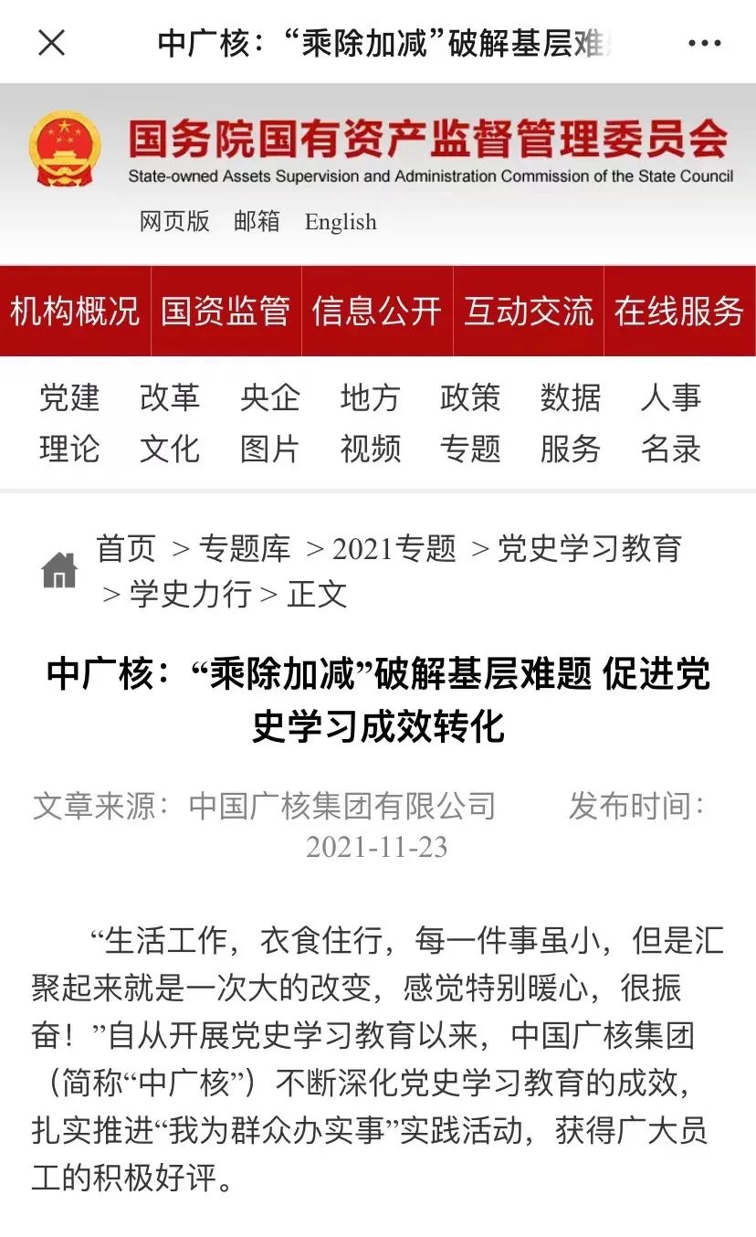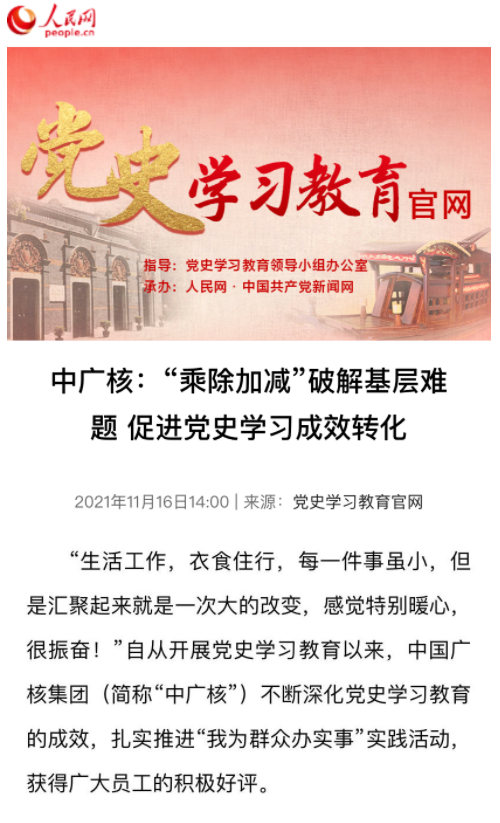 近日,黨史學(xué)習(xí)教育官網(wǎng)、國(guó)務(wù)院國(guó)資委官網(wǎng)、學(xué)習(xí)強(qiáng)國(guó)中央企業(yè)學(xué)習(xí)平臺(tái)等刊發(fā)了題為《中廣核:“乘除加減”破解基層難題,促進(jìn)黨史學(xué)習(xí)成效轉(zhuǎn)化》專題報(bào)道,從四個(gè)方向闡述了中國(guó)廣核集團(tuán)持續(xù)深化黨史學(xué)習(xí)教育,促進(jìn)成效轉(zhuǎn)化,重點(diǎn)聚焦基層一線員工、科研人員、偏遠(yuǎn)項(xiàng)目人員“急難愁盼”問(wèn)題,用實(shí)際行動(dòng)持續(xù)辦實(shí)事辦好事,大力營(yíng)造攜手團(tuán)結(jié)奮斗、共筑復(fù)興偉業(yè)的濃厚氛圍,強(qiáng)化思想引領(lǐng)、凝聚發(fā)展合力。