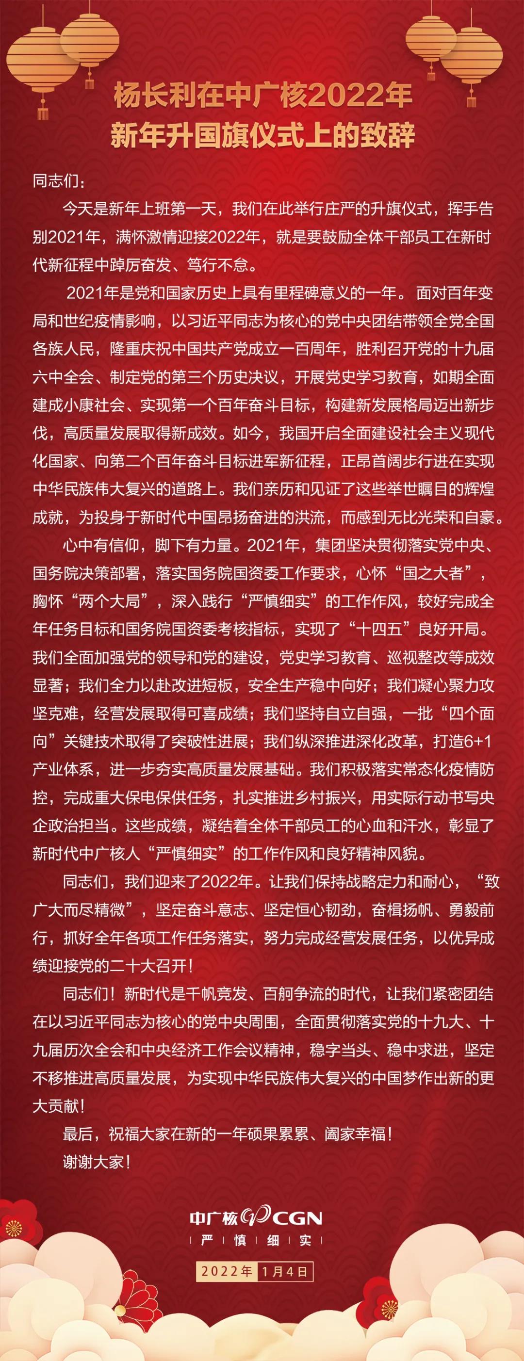 1月4日,中國廣核集團有限公司(簡稱“中廣核”)在深圳總部中廣核大廈舉行新年升國旗儀式,向偉大祖國獻上最美好的新年祝福,鼓舞激勵全體干部員工踔厲奮發、篤行不怠,以優異成績迎接黨的二十大召開。中廣核黨委書記、董事長楊長利參加升旗儀式并發表致辭,黨委副書記、總經理高立剛主持升旗儀式。中廣核黨委常委、總經理部成員,中國廣核電力股份有限公司經營高管,中廣核各部門及部分成員公司干部員工代表,參加了升旗儀式。
