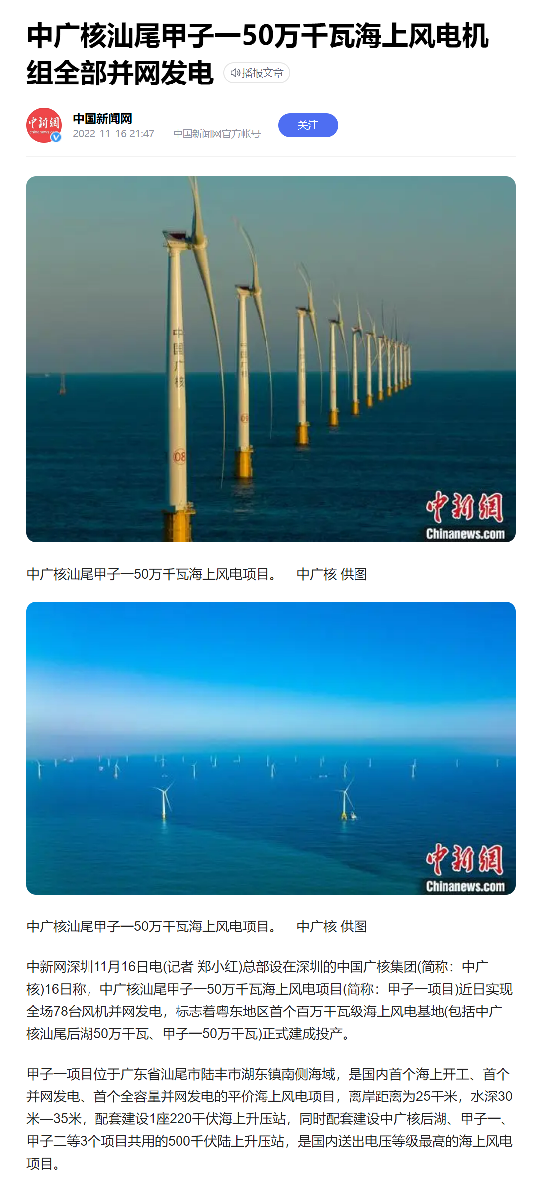 日前,中廣核汕尾甲子一50萬千瓦海上風(fēng)電項(xiàng)目(以下簡稱“甲子一項(xiàng)目”)順利實(shí)現(xiàn)全場78臺風(fēng)機(jī)并網(wǎng)發(fā)電,標(biāo)志著國內(nèi)首個平價(jià)海上風(fēng)電項(xiàng)目實(shí)現(xiàn)全容量并網(wǎng)發(fā)電,也標(biāo)志著粵東地區(qū)首個百萬千瓦級海上風(fēng)電基地(包括汕尾后湖50萬千瓦、甲子一50萬千瓦)正式建成投產(chǎn)。該項(xiàng)目建成投產(chǎn)為我國平價(jià)海上風(fēng)電開發(fā)建設(shè)提供了“中廣核樣本”。