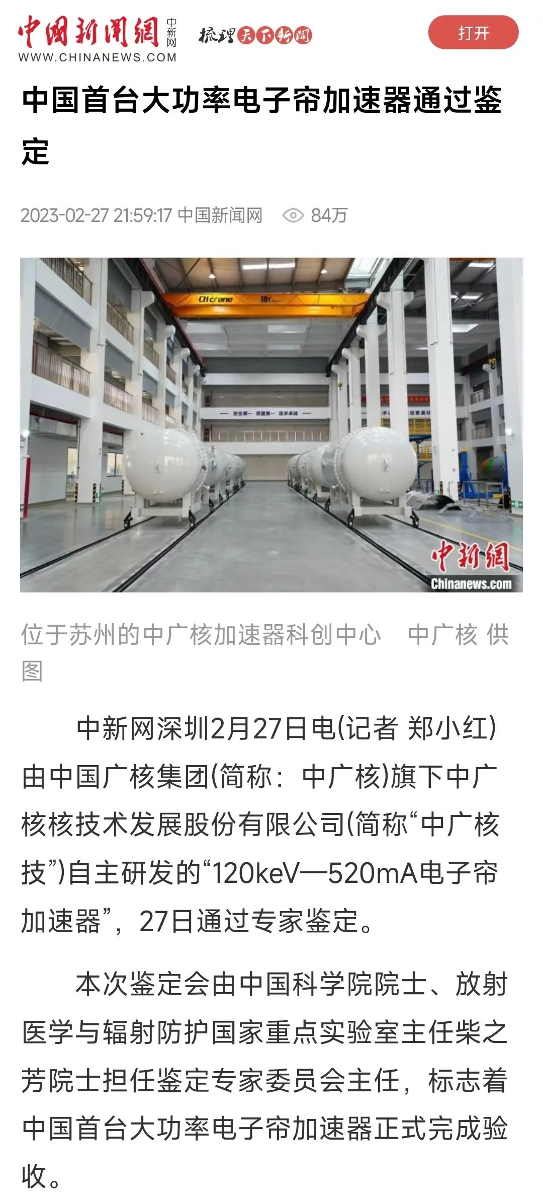2月27日,由中廣核核技術發展股份有限公司(股票代碼:000881.SZ)聯合中科院近物所研發的“120keV-520mA電子簾加速器”通過專家鑒定。本次鑒定會由同輻行業協會組織,中國科學院院士、放射醫學與輻射防護國家重點實驗室主任柴之芳院士擔任鑒定專家委員會主任,標志著我國首臺大功率電子簾加速器正式完成驗收。與傳統的技術路線相比,該設備能耗低、固化成本低、效率高,能夠為我國EB固化(Electron Beam Curing)、薄膜改性、紡織品接枝、消毒滅菌等產業提供技術保障,具有可觀的經濟價值、社會效益和生態效益。尤其在我國推進“碳達峰、碳中和”的戰略背景下,為傳統工業行業實施綠色制造提供了一種新途徑。