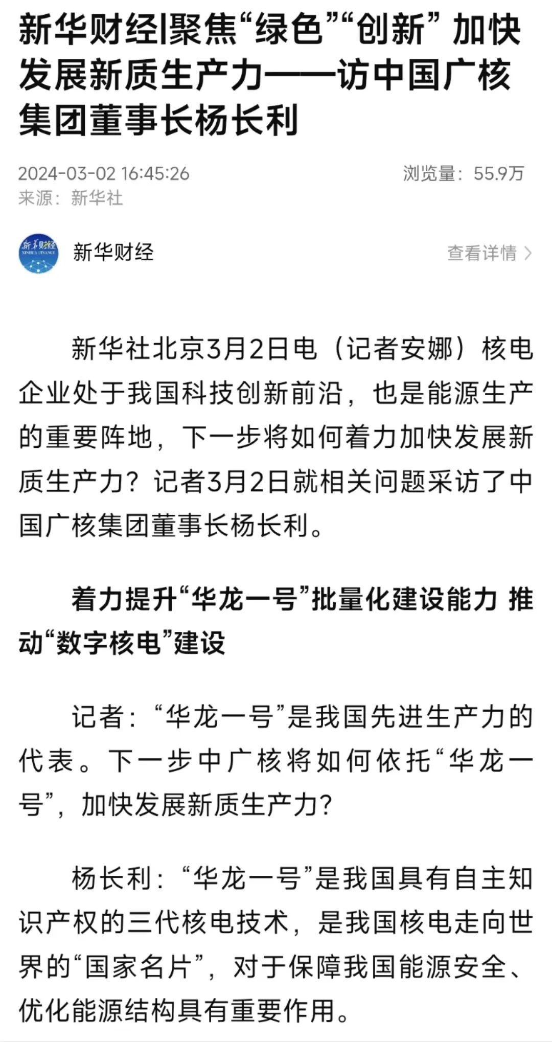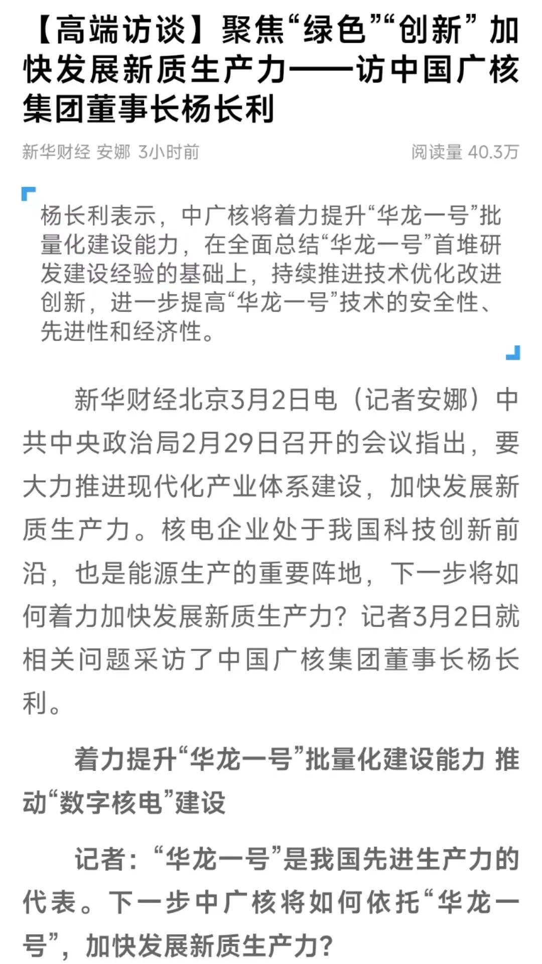 3月2日,新華社聚焦“綠色”“創(chuàng)新” 加快發(fā)展新質(zhì)生產(chǎn)力,專訪第十四屆全國(guó)政協(xié)委員,中國(guó)廣核集團(tuán)有限公司黨委書記、董事長(zhǎng)楊長(zhǎng)利。報(bào)道中提到中廣核將著力提升“華龍一號(hào)”批量化建設(shè)能力,推動(dòng)“數(shù)字核電”建設(shè)以及新能源業(yè)務(wù)高質(zhì)量發(fā)展,進(jìn)一步優(yōu)化科技創(chuàng)新布局在核醫(yī)學(xué)等領(lǐng)域開(kāi)展科技攻堅(jiān)。