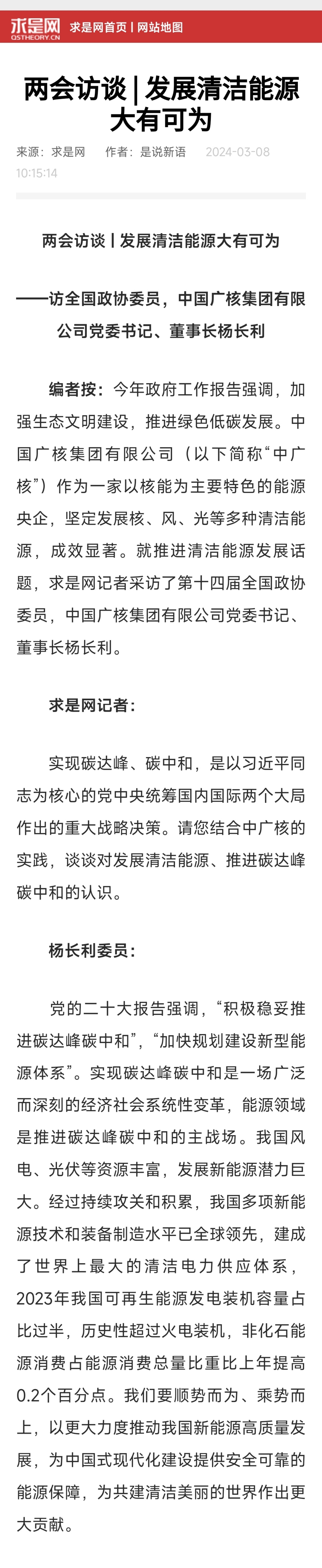 兩會(huì)訪談 | 發(fā)展清潔能源大有可為——訪全國(guó)政協(xié)委員,中國(guó)廣核集團(tuán)有限公司黨委書記、董事長(zhǎng)楊長(zhǎng)利