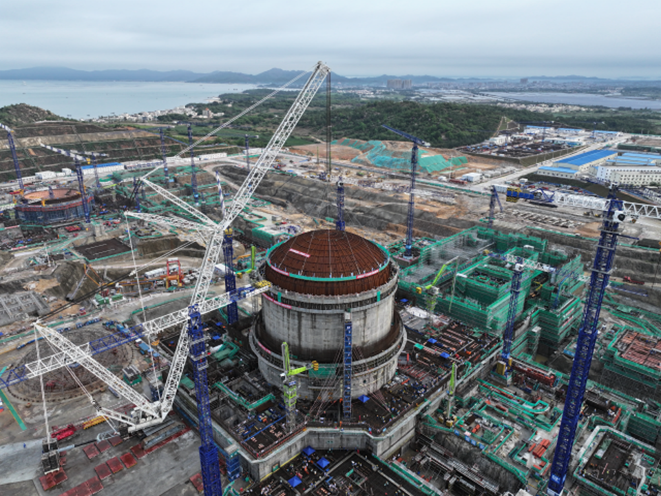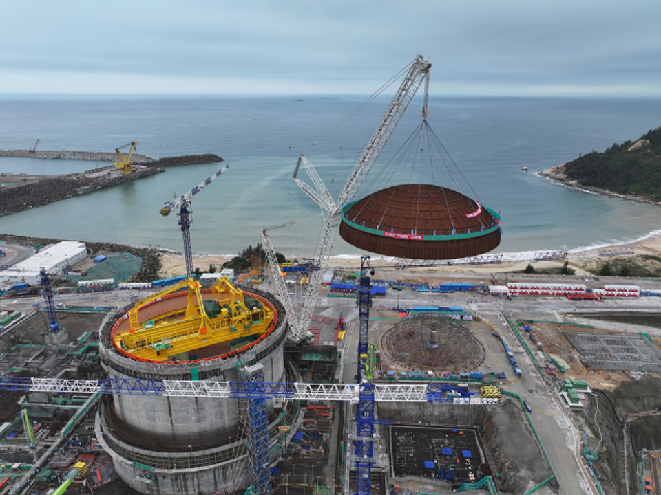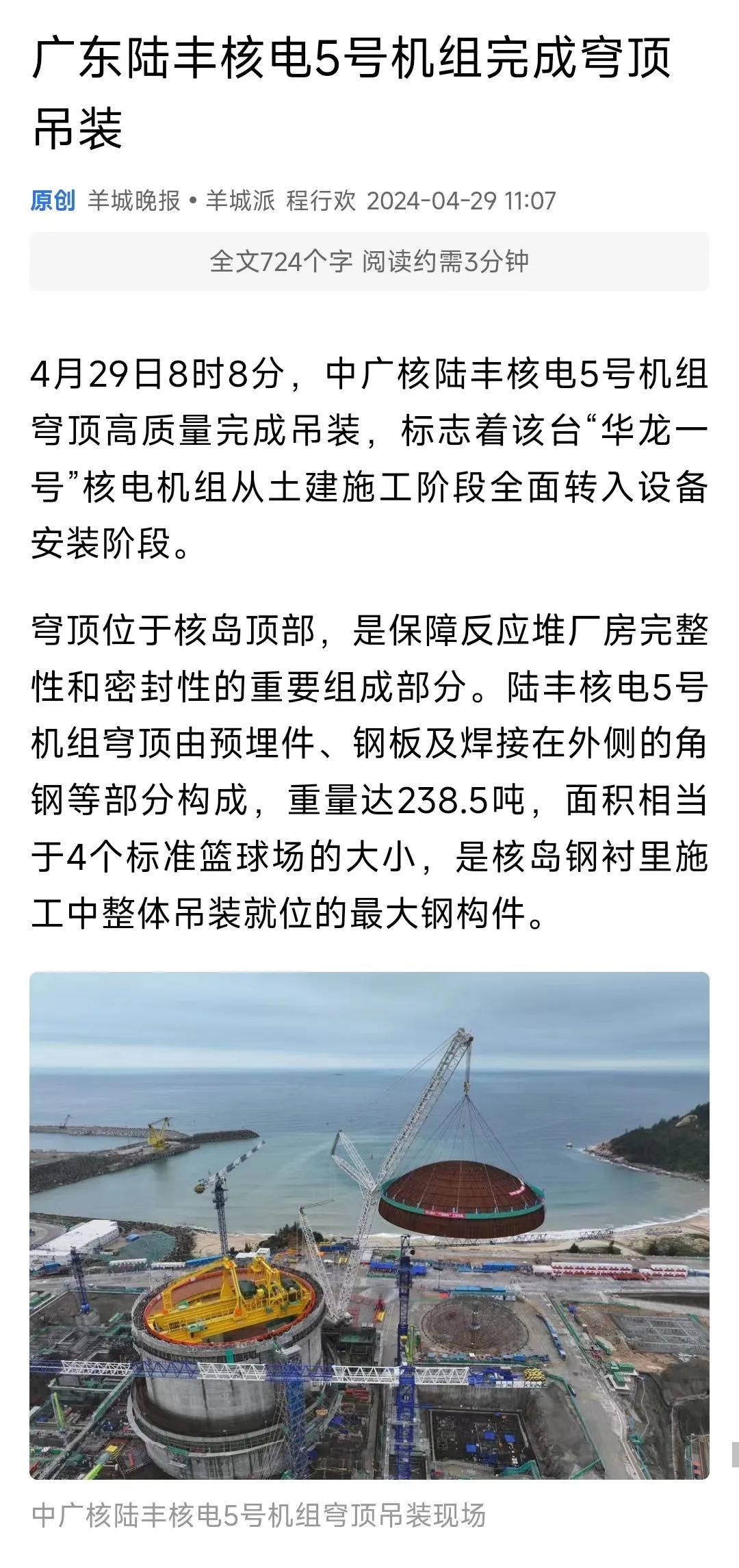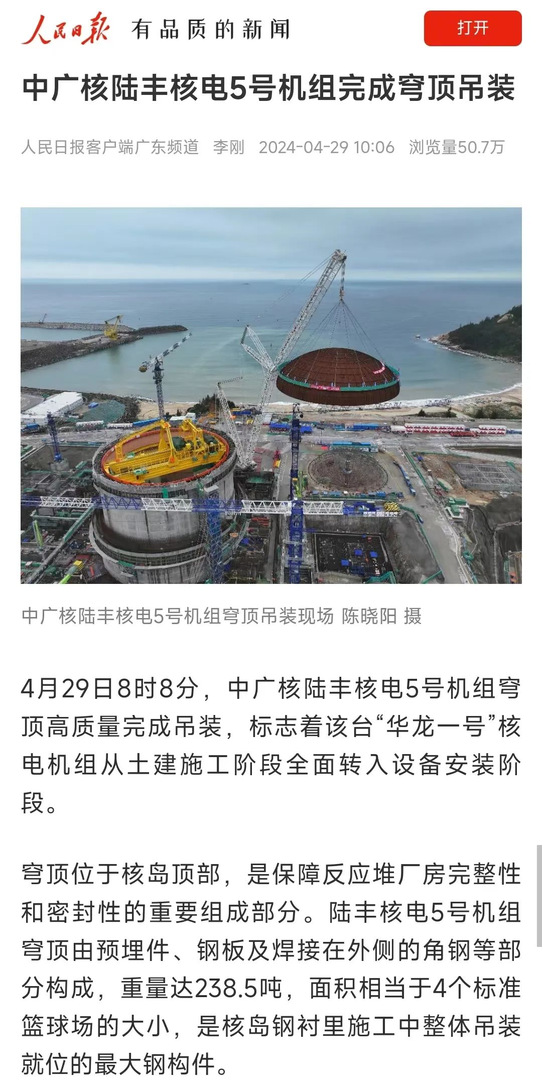4月29日8時8分,中廣核廣東陸豐核電項目5號機組穹頂完成吊裝,標志著該臺“華龍一號”核電機組從土建施工階段全面轉入設備安裝階段。人民日報、新華社、央視等多家主流媒體對此進行聚焦報道。