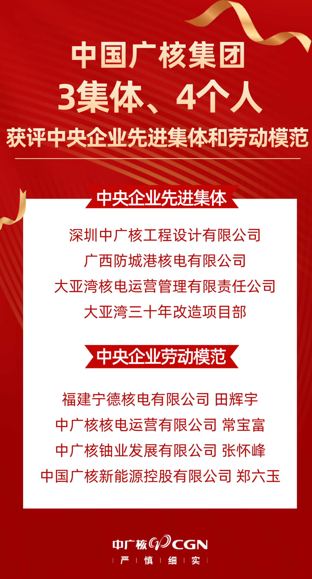 人力資源社會保障部、國務院國資委決定,授予491個集體“中央企業先進集體”稱號,授予792名同志“中央企業勞動模范”稱號。中國廣核集團3個集體被授予“中央企業先進集體”稱號,4名員工被授予“中央企業勞動模范”稱號。