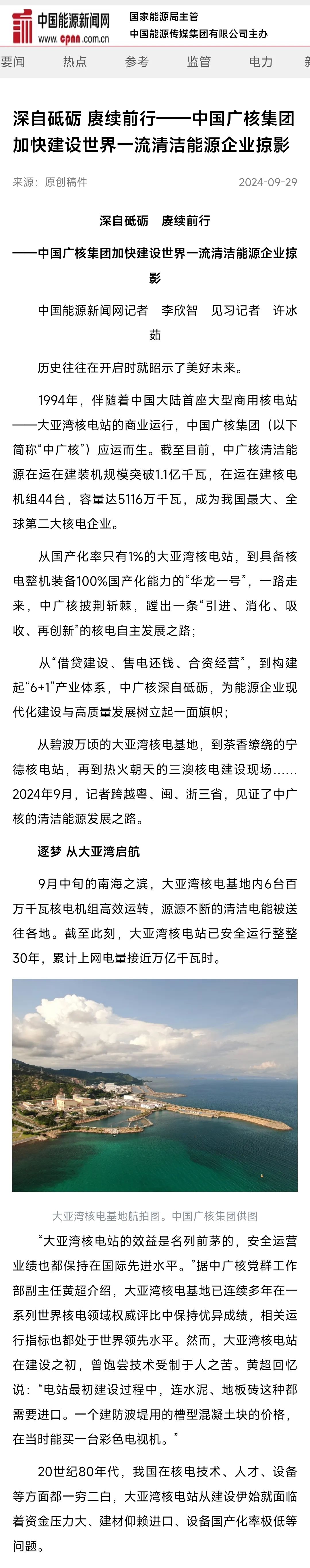 記者們結合實地探訪的所見所聞,以專業的視角和深入的筆觸,刊發了一系列相關的采訪報道,向公眾展示了中廣核數十年來在清潔能源領域的成果成效、科技創新,以及對國家能源安全和可持續發展所作出的重要貢獻。