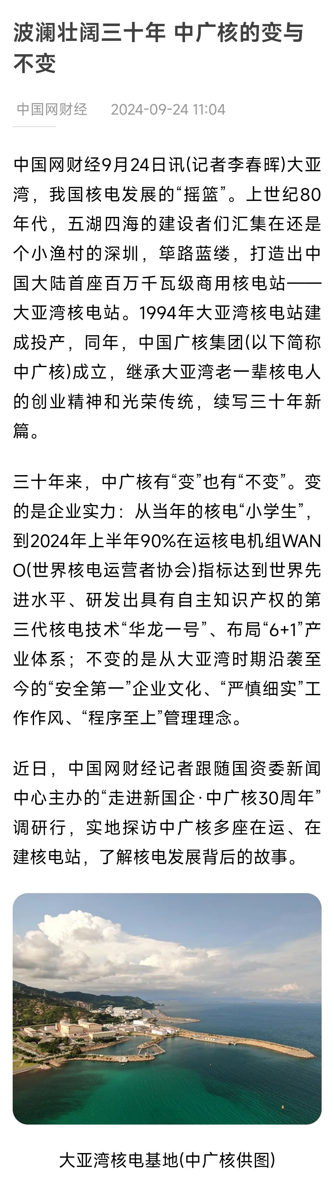 近期,國務院國資委新聞中心組織開展“走進新國企”系列調研行,20余家媒體記者實地探訪了中廣核大亞灣核電基地、中廣核寧德核電基地、中廣核浙江三澳核電基地、中廣核研究院有限公司南方中心以及中廣核工程有限公司設計院等地,了解中廣核高質量發展背后的故事。