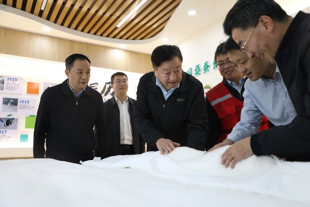 ▲楊長利查看隴槐村手工制作的桑蠶絲被