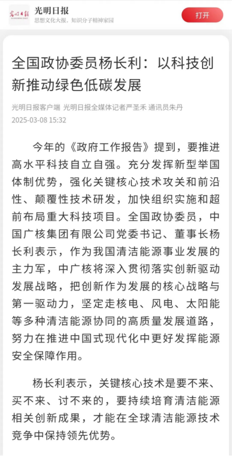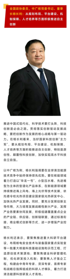 2025年全國兩會期間,全國政協委員、中國廣核集團有限公司黨委書記、董事長楊長利積極履職盡責,圍繞科技創新、清潔能源融合發展以及人工智能技術應用落地等熱點問題積極發聲,人民日報、新華社、中央廣播電視總臺新聞聯播、科技日報等多家媒體關注和報道,產生廣泛的社會影響。