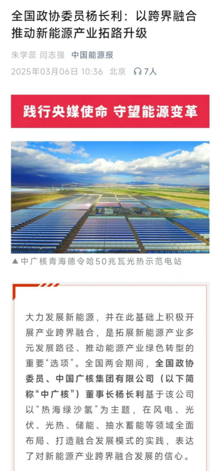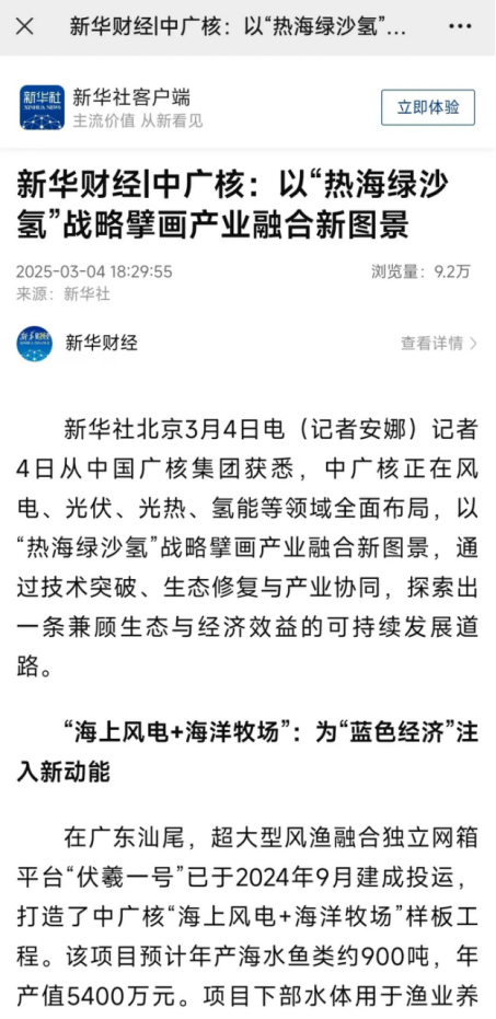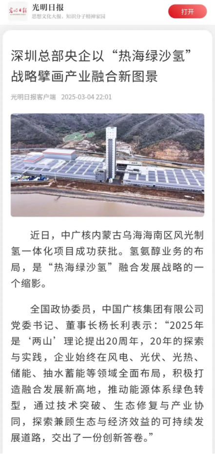 《人民日報》:中廣核正在風電、光伏、光熱、氫能等領域全面布局,以“熱海綠沙氫”戰略擘畫產業融合新圖景,通過技術突破、生態修復與產業協同,探索出一條兼顧生態與經濟效益的可持續發展道路。