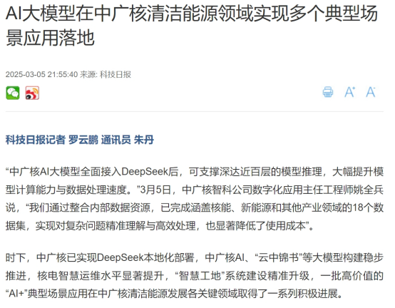《新華財經》:人工智能是今年兩會期間的熱點話題。“中廣核AI大模型已完成DeepSeek的全面接入,實現了DeepSeek模型的本地化部署。同時,一系列核電特種機器人正在核電建造、運維等領域大顯身手?!睏铋L利說,后續中廣核將進一步探索人工智能與核電、新能源場景的深度融合,持續提升生產安全與效率。