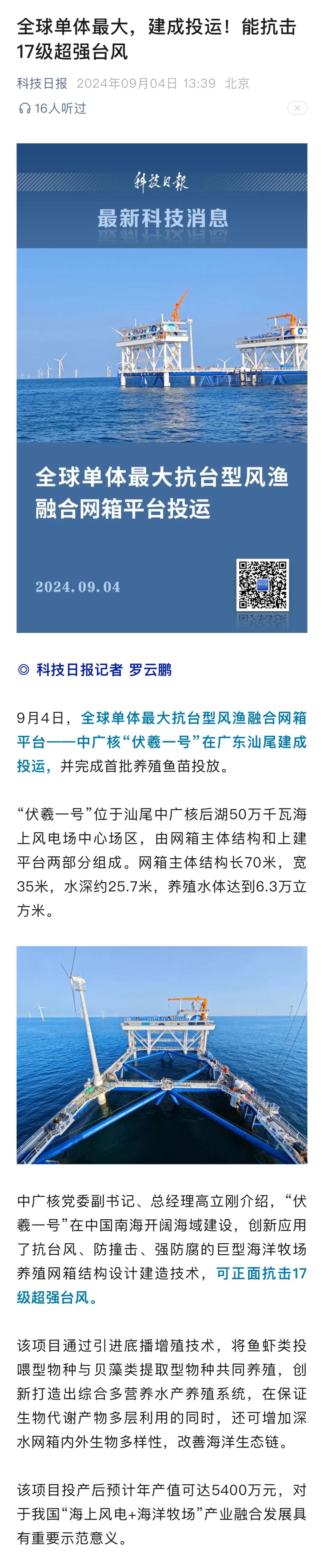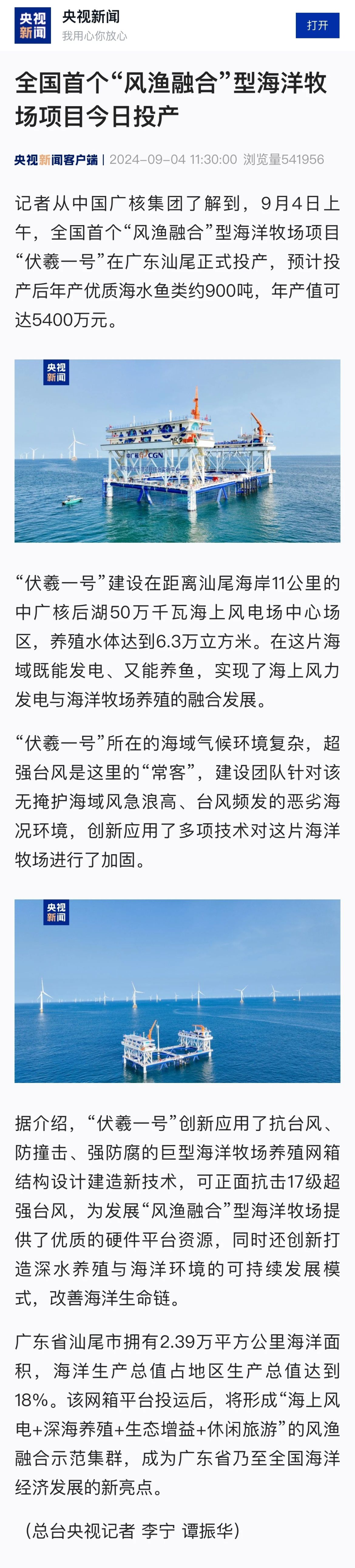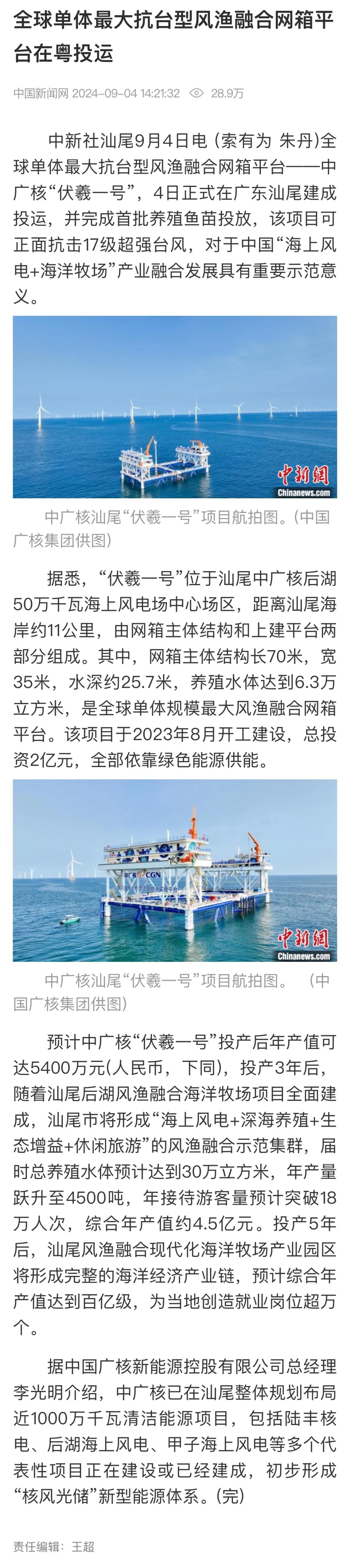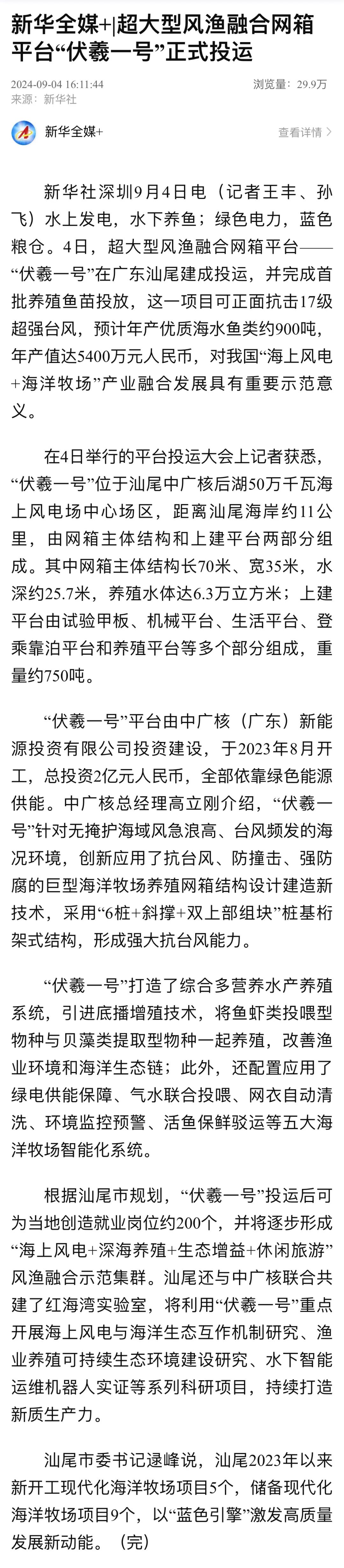 9月4日,中廣核汕尾“伏羲一號”風漁融合項目正式投運,并完成首批養殖魚苗投放,該項目可正面抗擊17級超強臺風,預計投產后年產值可達5400萬元,對于我國“海上風電+海洋牧場”產業融合發展具有重要示范意義。人民日報、新華社、央視等數十家主流媒體對此進行聚焦報道。
