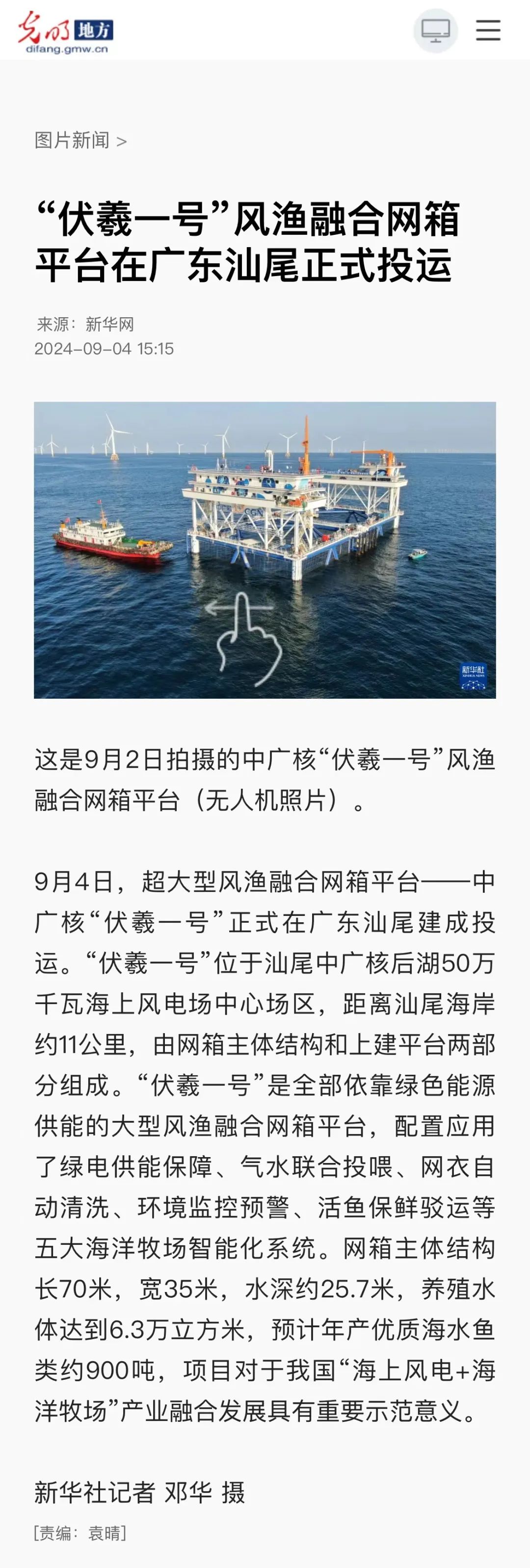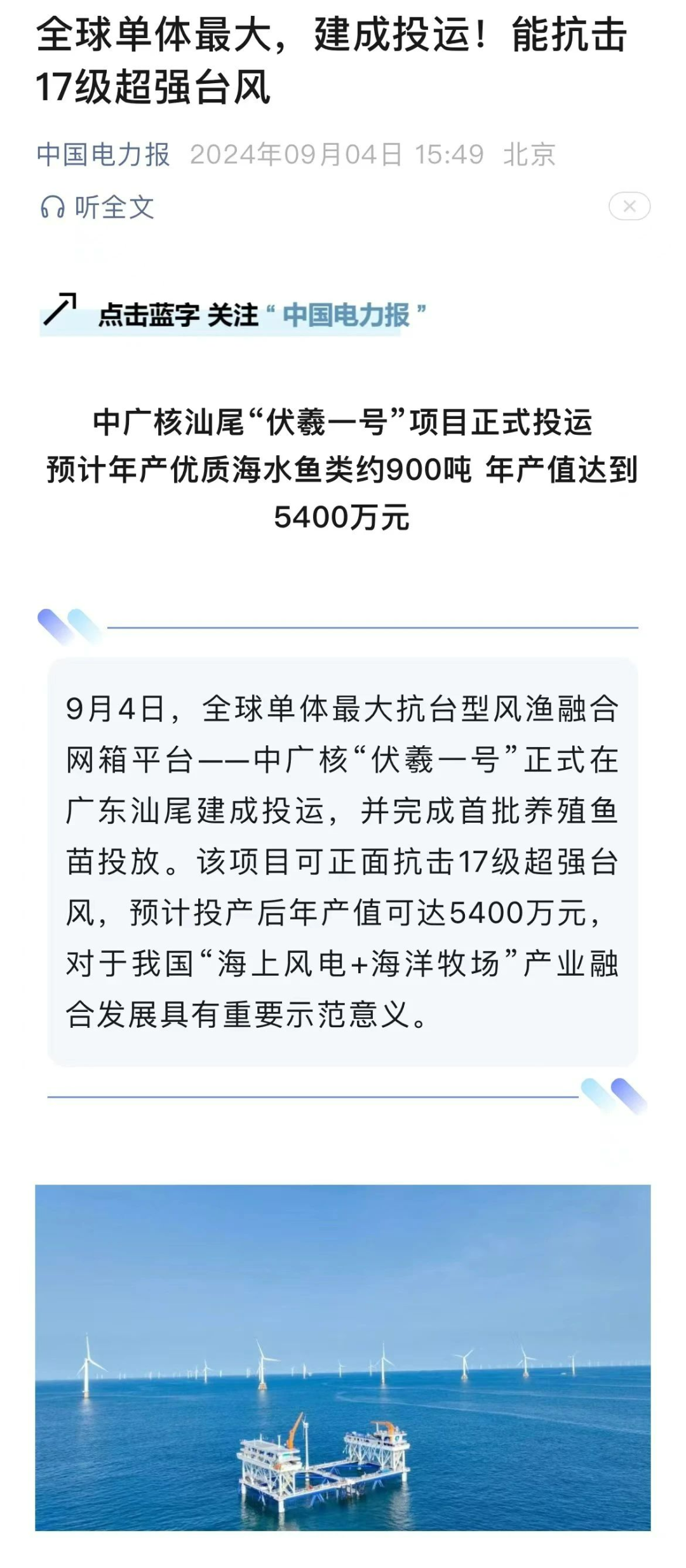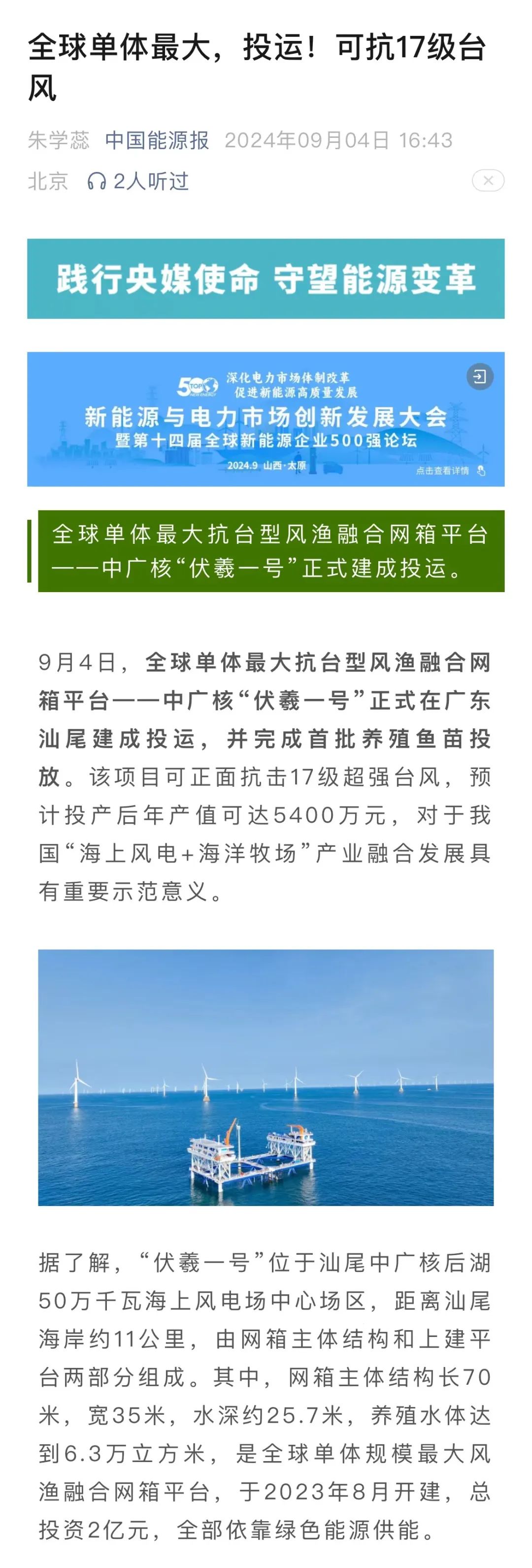 9月4日,中廣核汕尾“伏羲一號”風漁融合項目正式投運,并完成首批養殖魚苗投放,該項目可正面抗擊17級超強臺風,預計投產后年產值可達5400萬元,對于我國“海上風電+海洋牧場”產業融合發展具有重要示范意義。人民日報、新華社、央視等數十家主流媒體對此進行聚焦報道。