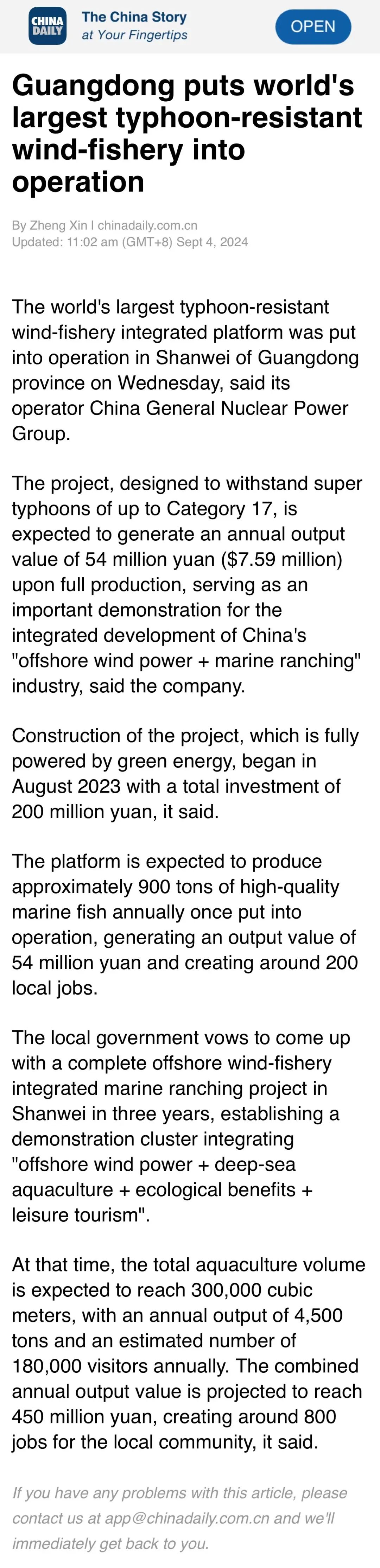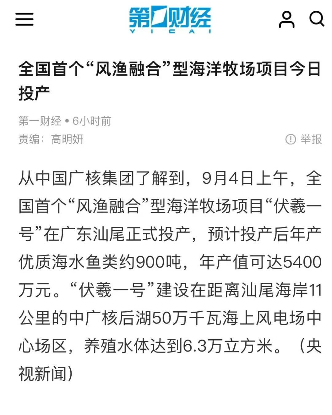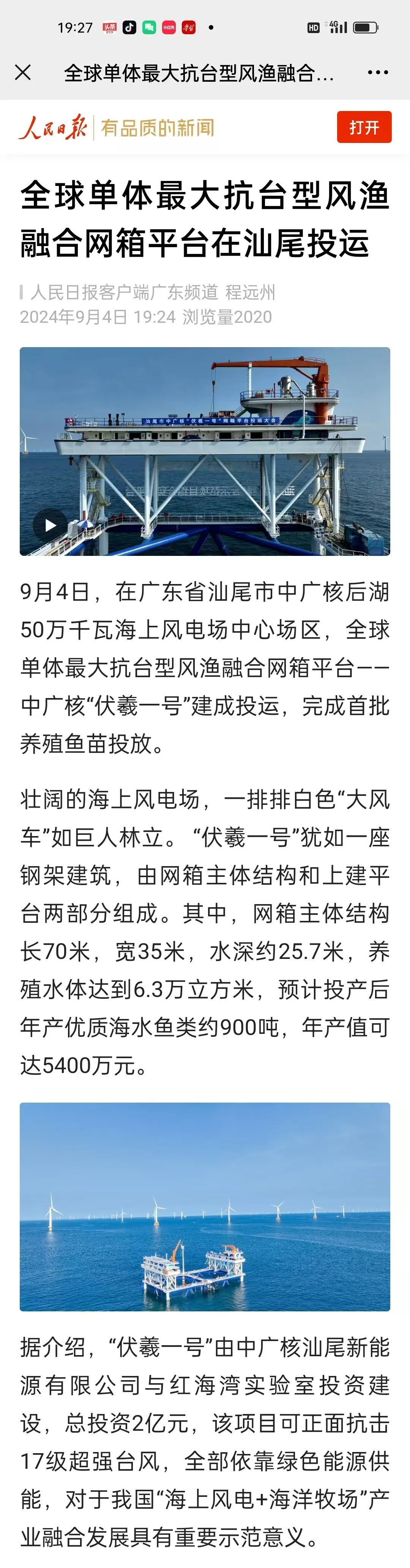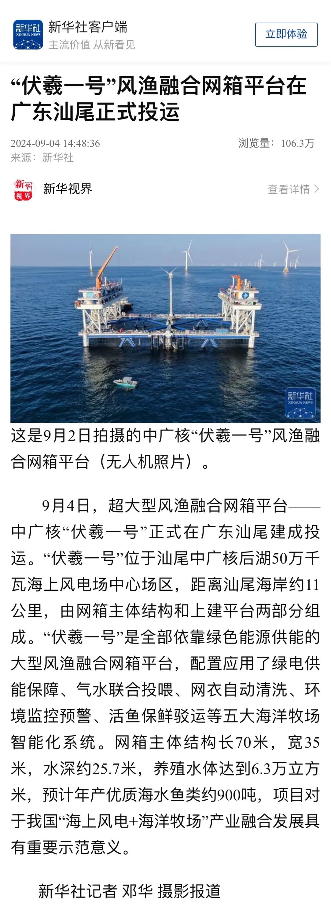 9月4日,中廣核汕尾“伏羲一號”風漁融合項目正式投運,并完成首批養殖魚苗投放,該項目可正面抗擊17級超強臺風,預計投產后年產值可達5400萬元,對于我國“海上風電+海洋牧場”產業融合發展具有重要示范意義。人民日報、新華社、央視等數十家主流媒體對此進行聚焦報道。