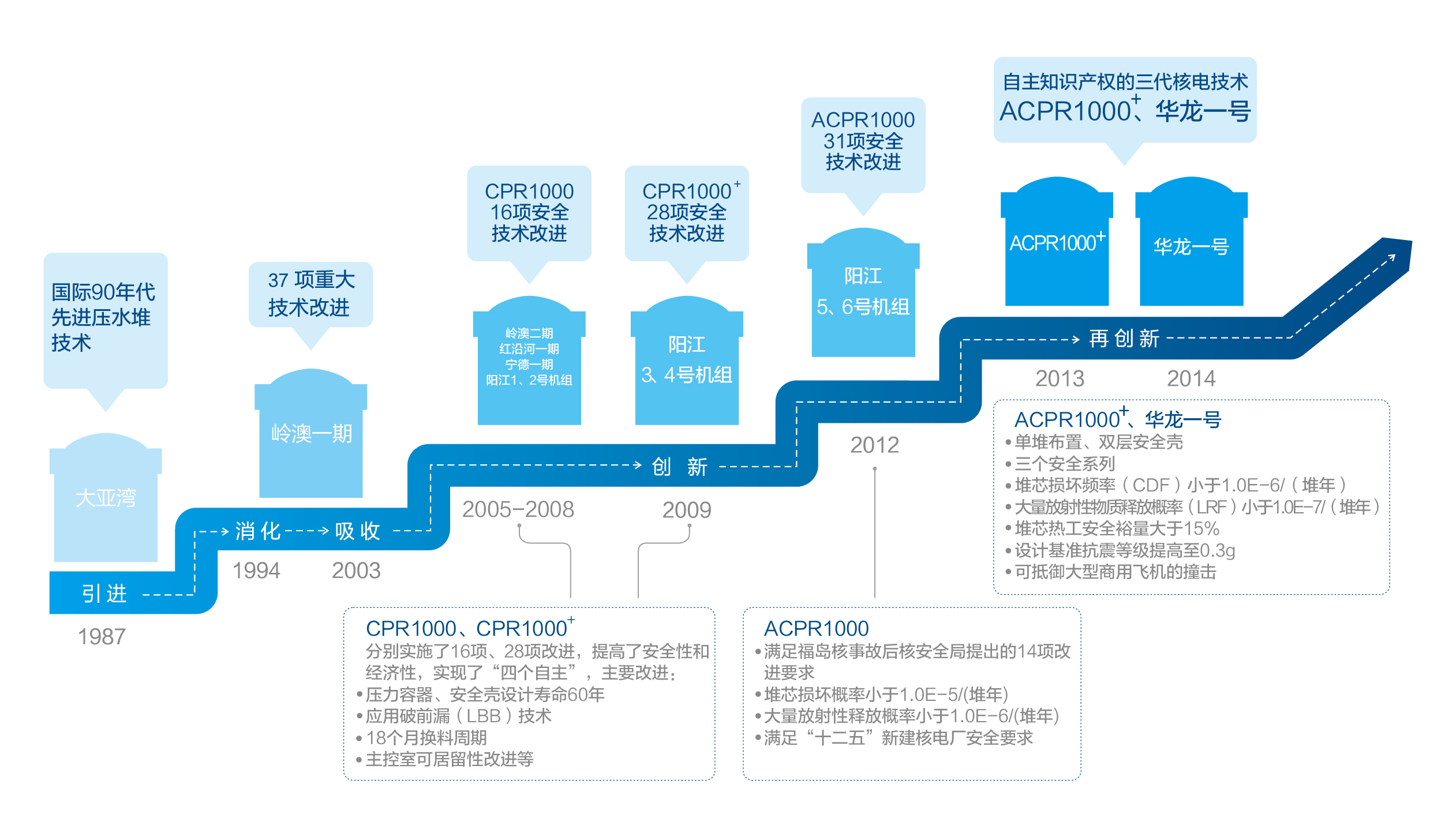 由中國兩大核電企業中國廣核集團(簡稱:中廣核、CGN)和中國核工業集團 (簡稱:中核、CNNC)聯合開展,研發設計方案已經基本成型,具備開工建設的條件。 該技術融合了"能動與非能動"先進設計理念,主要技術指標和安全指標滿足我國和 全球最新安全要求,具有完全自主知識產權。